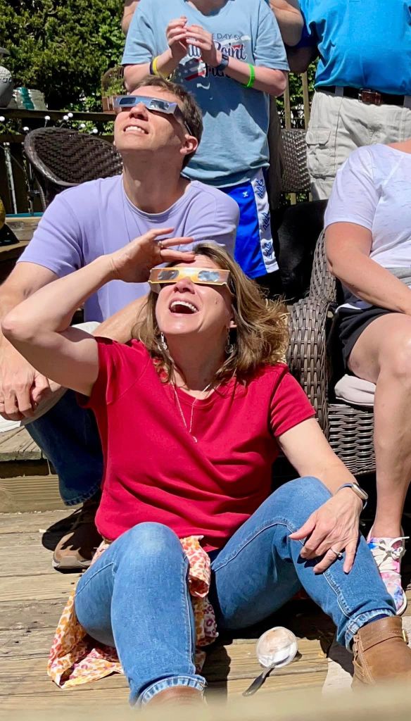 But I finally got the chance on April 8, 2024, to witness one. Some travel long distances chasing eclipses, but occasionally, like in Missouri in *both* 2017 and 2024, one can happen in your neighborhood backyard. And nothing, and I mean NOTHING, can prepare you for the grandeur of nature’s greatest spectacle, a total eclipse of the sun. While eclipses can be predicted far in advance with great accuracy by astronomers, the weather can’t. Many flocked to Texas in 2024, hoping for clear skies, but we headed to Cape Girardeau, Missouri. While the morning was foggy, the weather began clearing as the big moment approached. About 30 minutes before totality, that moment when the moon blocks the sun, the skies cleared completely. We ripped off our protective glasses and were surrounded by dark skies. Birds quieted while streetlights dimmed. We shrieked with delight at the sight of a black disc blotting out the sun! Visible corona rays streaked in different directions. A bright pink jewel sparkled like a gemstone along the moon’s lower edge. We later learned it was a solar prominence. Having witnessed this glorious, gob-smacking display, I am excited for 2045 when the moon’s shadow will again cross the USA!