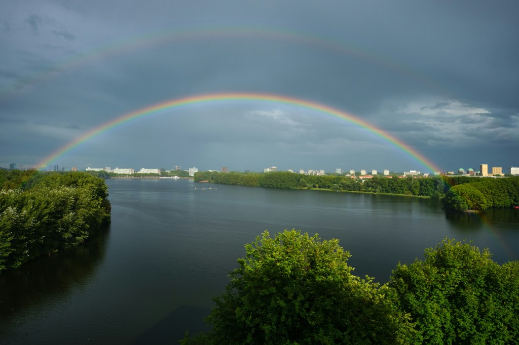 4. A Triple Rainbow – Most of us have seen rainbows; they are fairly common. But you have to intentionally hunt for them. There’s a trick – look for rainbows right after a rain shower when the sun pops out. Face away from the sun. Occasionally, with intense sunlight and the right conditions, two or more bows are visible. I’ve seen double rainbows several times. The second bow’s colors appear in reverse order (VIBGYOR instead of ROYGBIV!) and are lighter in intensity. In 1997, though, at the southern tip of South America, I spotted a rare triple rainbow. A double rainbow stretched across the bay, while the third band faintly streaked the sky above it all.
